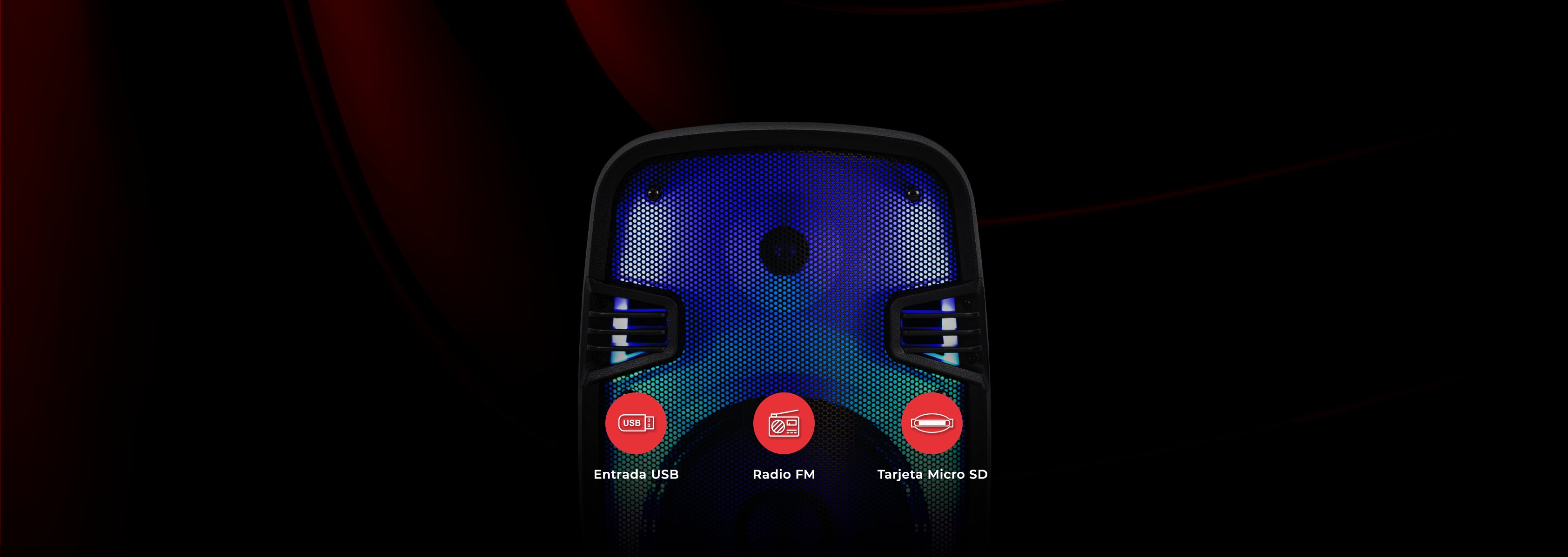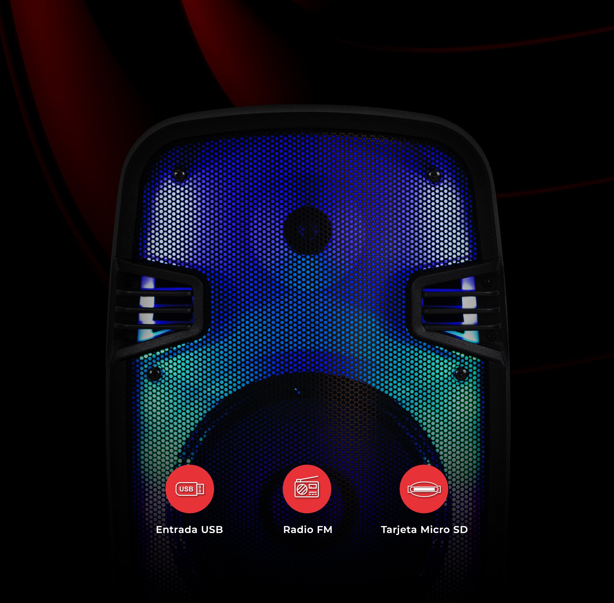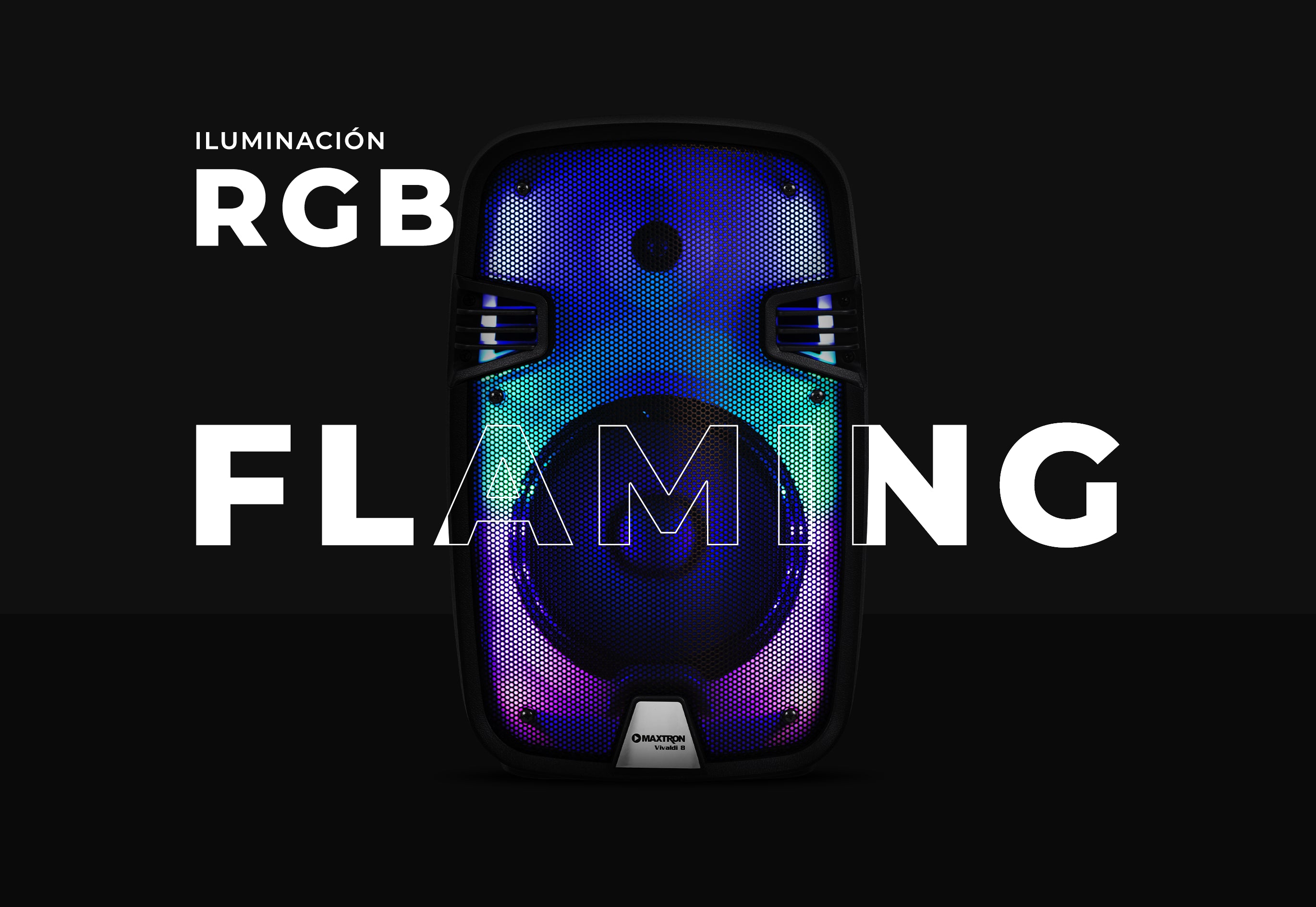 La iluminación RGB FLAMING crea un ambiente de fiesta único. Con colores vibrantes y efectos de iluminación dinámicos, el parlante será el centro de atención en cualquier evento.