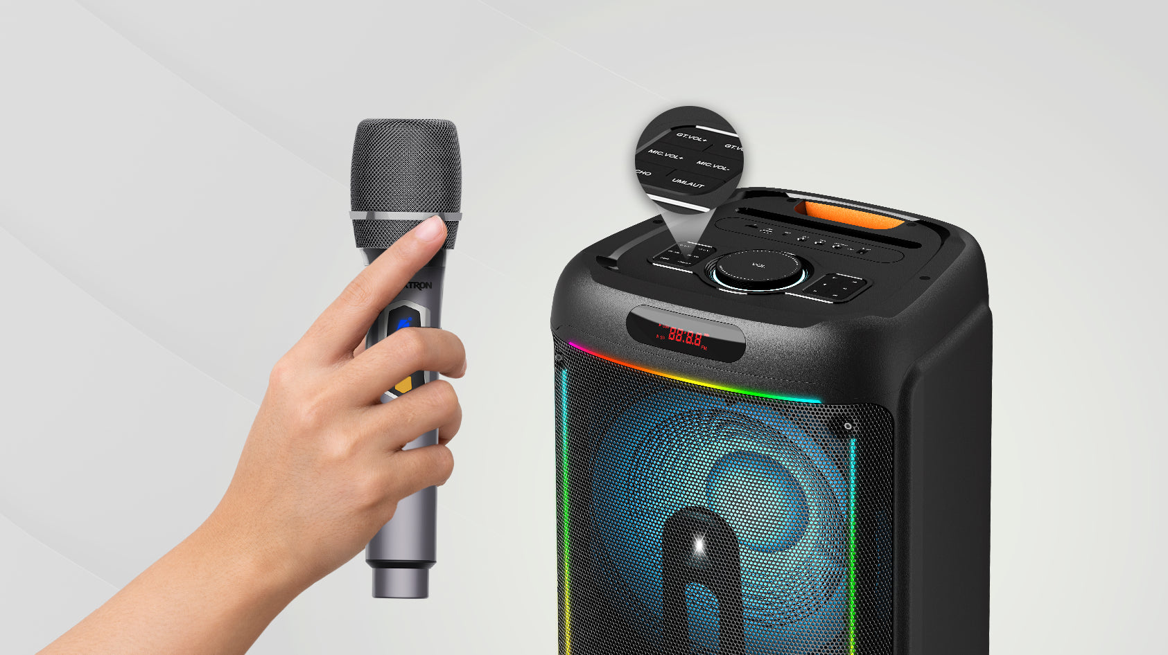 La iluminación RGB Flaming crea un ambiente de fiesta único. Con colores vibrantes y efectos de iluminación dinámicos, el parlante será el centro de atención en cualquier evento.
