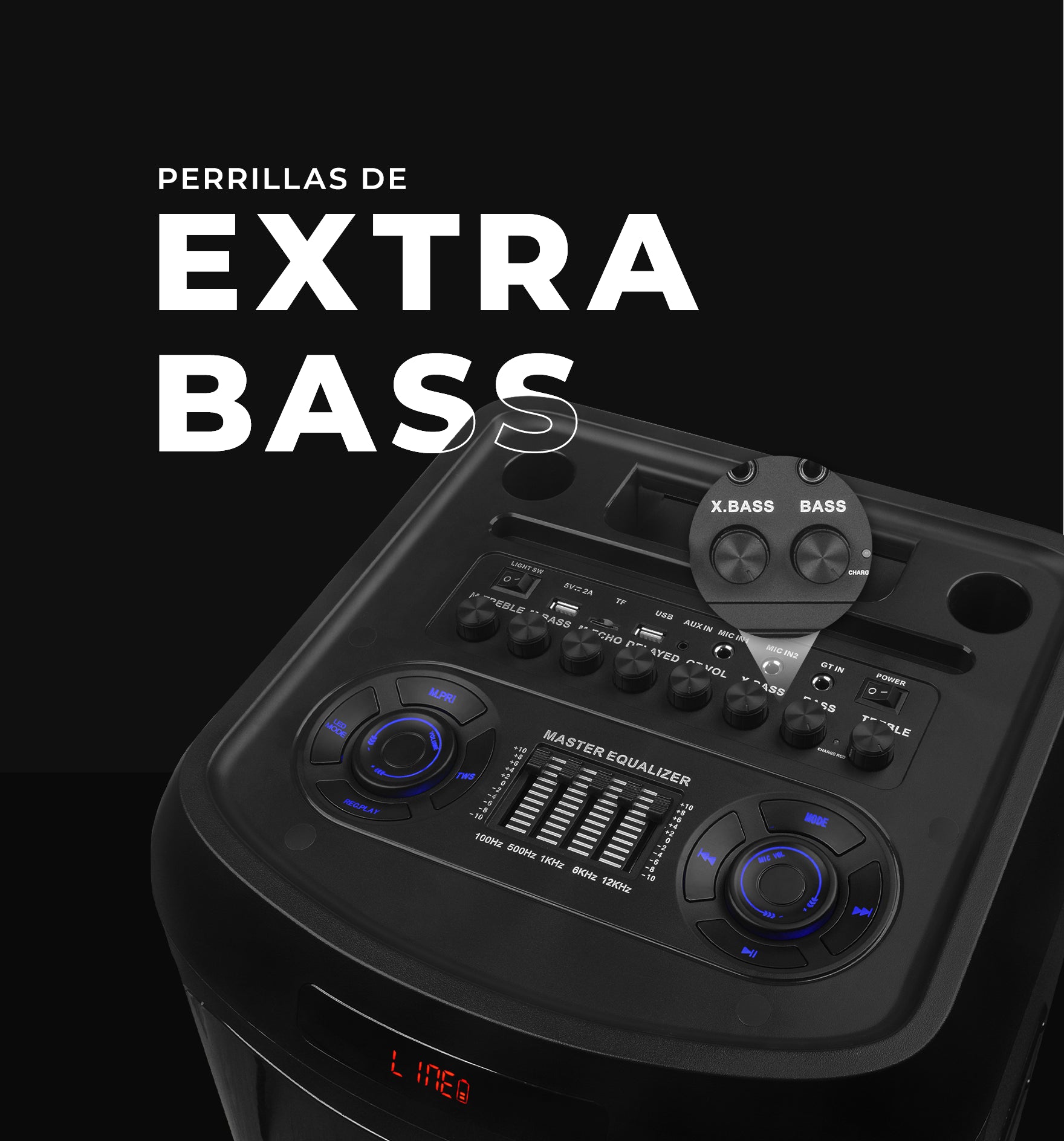 Perillas | - Perilla de Volumen - Perilla de Volumen de Micrófono - Perilla de Volumen de Guitarra - Perillas de Ecualizado (Bajos, Agudos) - Perilla de EXTRA BASS - Perilla de Eco, Agudas y Bajos de Micrófono - Perilla de Delay de Micrófono - Perillas de Ecualizador de 5 BANDAS |