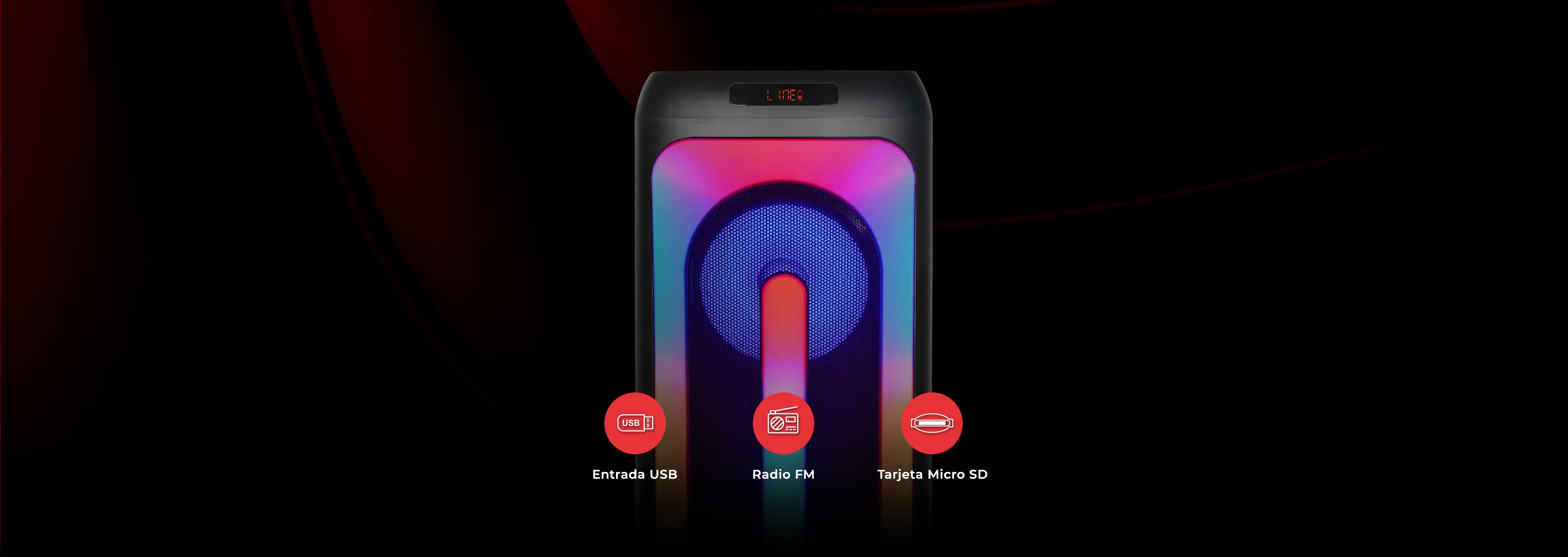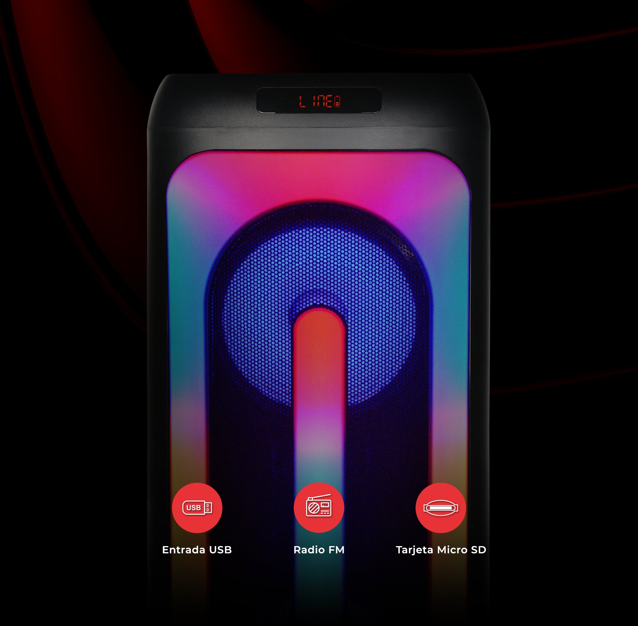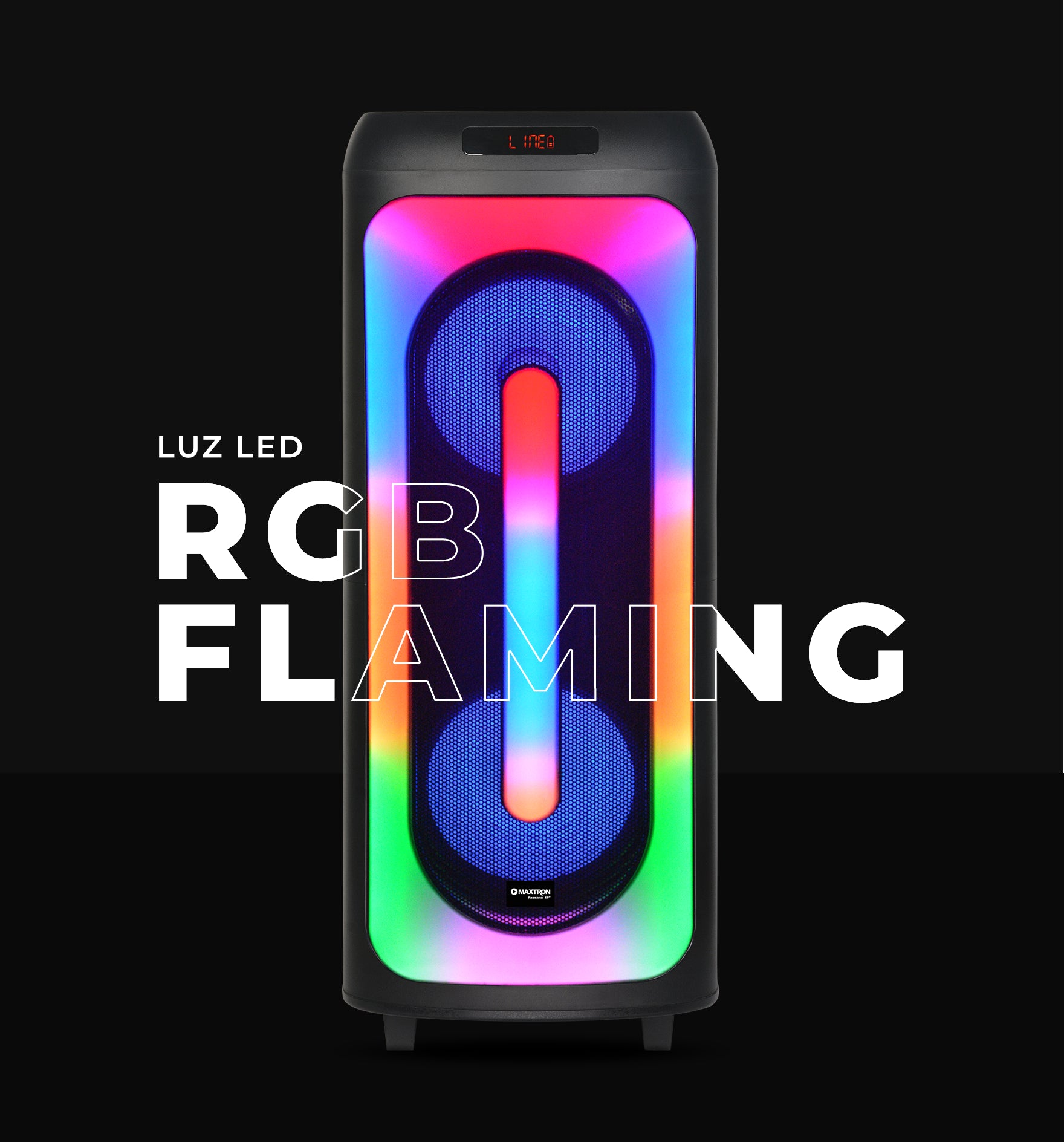 La iluminación RGB Flaming crea un ambiente de fiesta único. Con colores vibrantes y efectos de iluminación dinámicos, el parlante será el centro de atención en cualquier evento.