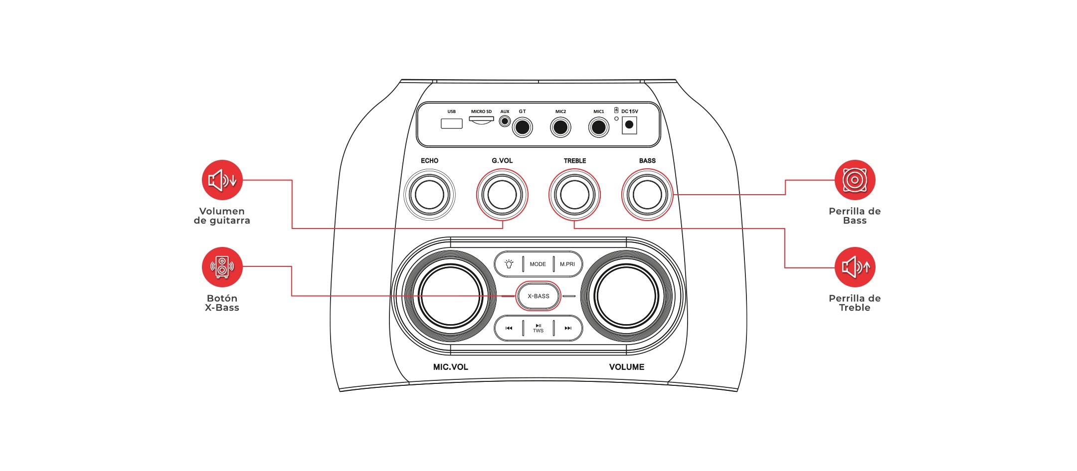 | Perillas | - Perillas de Volumen - Perillas de Volumen de Micrófono - Perilla de Eco de Micrófono - Perilla de Bajos - Perilla de Agudos - Perilla de Volumen de Guitarra |