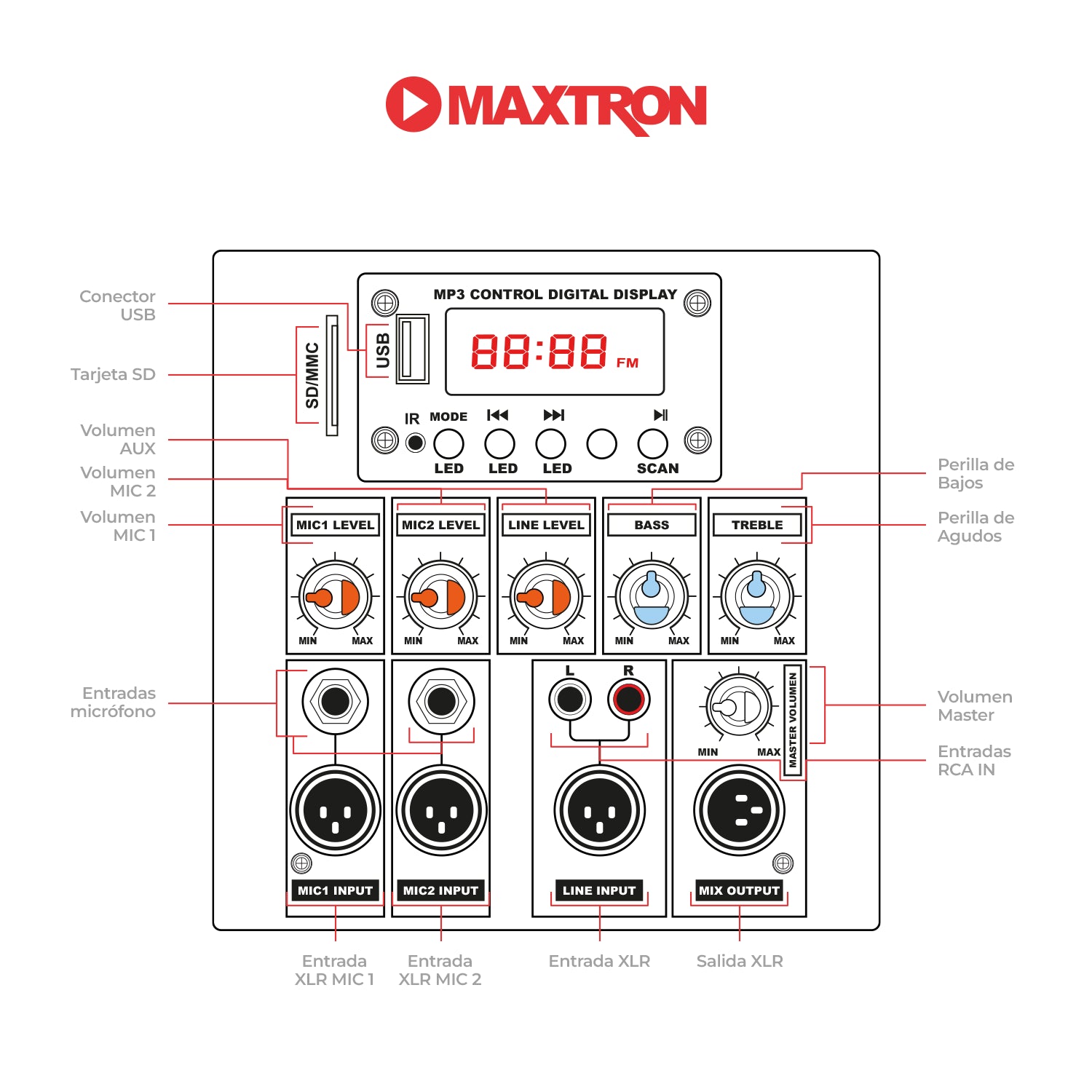 Entradas | - 2 Entradas XLR para Micrófonos - Entrada XLR para Fuentes Externas de Audio - Entrada RCA para Fuentes Externas de Audio - 2 Entradas 6.35mm para Micrófono |